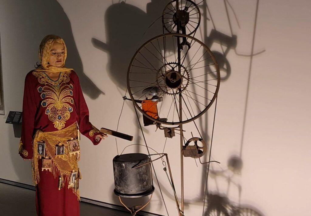 Uno dei momenti più intensi della performance si è svolto al Louvre di Abu Dhabi, accanto all’opera “Presse pour oranges A+B” di Jean Tanguely. Questo dialogo simbolico tra l’abito-museo di Tassi e la scultura di Tanguely – artista svizzero “erede” di Duchamp, che tra gli anni ’50 e ’70 recuperava oggetti scartati dalla società dei consumi per trasformarli in installazioni meccaniche multisensoriali.