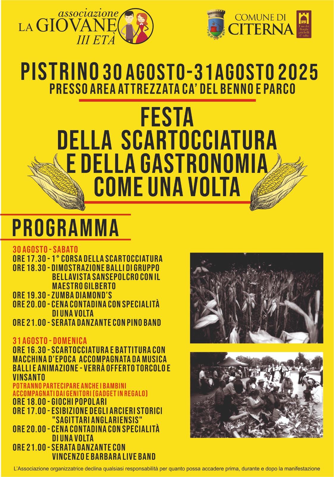 Organizzata da “La giovane terza età Aps” con il patrocinio del Comune di Citerna, sabato 30 e domenica 31 agosto a Pistrino (area attrezzata Ca’ del Benno e Parco) si terrà la “Festa della scartocciatura e della gastronomia come una volta”.