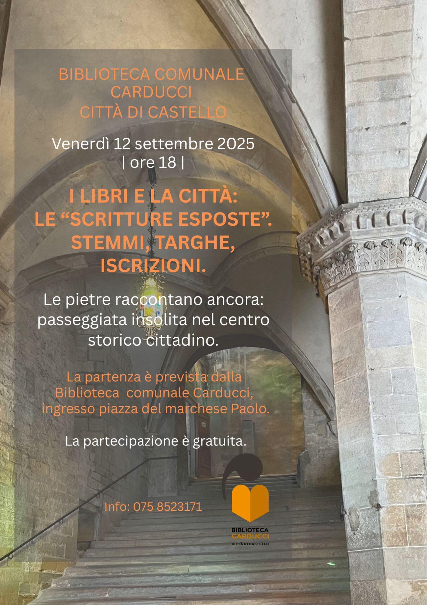 “Le scritture esposte. Stemmi, targhe, iscrizioni”. Le pietre raccontano ancora”. Questo il senso del nuovo appuntamento con “I libri e la città”, iniziativa organizzata dalla Biblioteca comunale Carducci di Città di Castello, una passeggiata insolita nel centro storico per riscoprire la storia cittadina attraverso le testimonianze scritte su muri e monumenti. L’itinerario, di circa un’ora, si snoderà attraverso sei tappe alla ricerca delle pietre parlanti che testimoniano piccoli e grandi eventi della città. Le iscrizioni, spesso collocate in alto sui muri dei palazzi, sfuggono solitamente agli occhi frettolosi di chi passa per i vicoli e le piazze del centro; esse nascono per celebrare monumenti pubblici come il Palazzo comunale o la Cattedrale, omaggiare illustri tifernati o ricordare antichi culti. “Una bella iniziativa che coniuga la storia della città, dei suoi palazzi, monumenti e opere con la curiosità di scoprire aspetti inediti di Città di Castello che sfuggono talvolta alla visone di cittadini e turisti. Silvia Palazzi con la sua consueta competenza e passione ci guiderà attraverso un tour cittadino fra piazze, vicoli, e scorci urbani di rara bellezza”, ha dichiarato l’assessore alla cultura, Michela Botteghi. L’appuntamento è fissato per venerdì 12 settembre alle ore 18 e la partenza è prevista dalla Biblioteca, ingresso piazza del marchese Paolo. La partecipazione è gratuita.