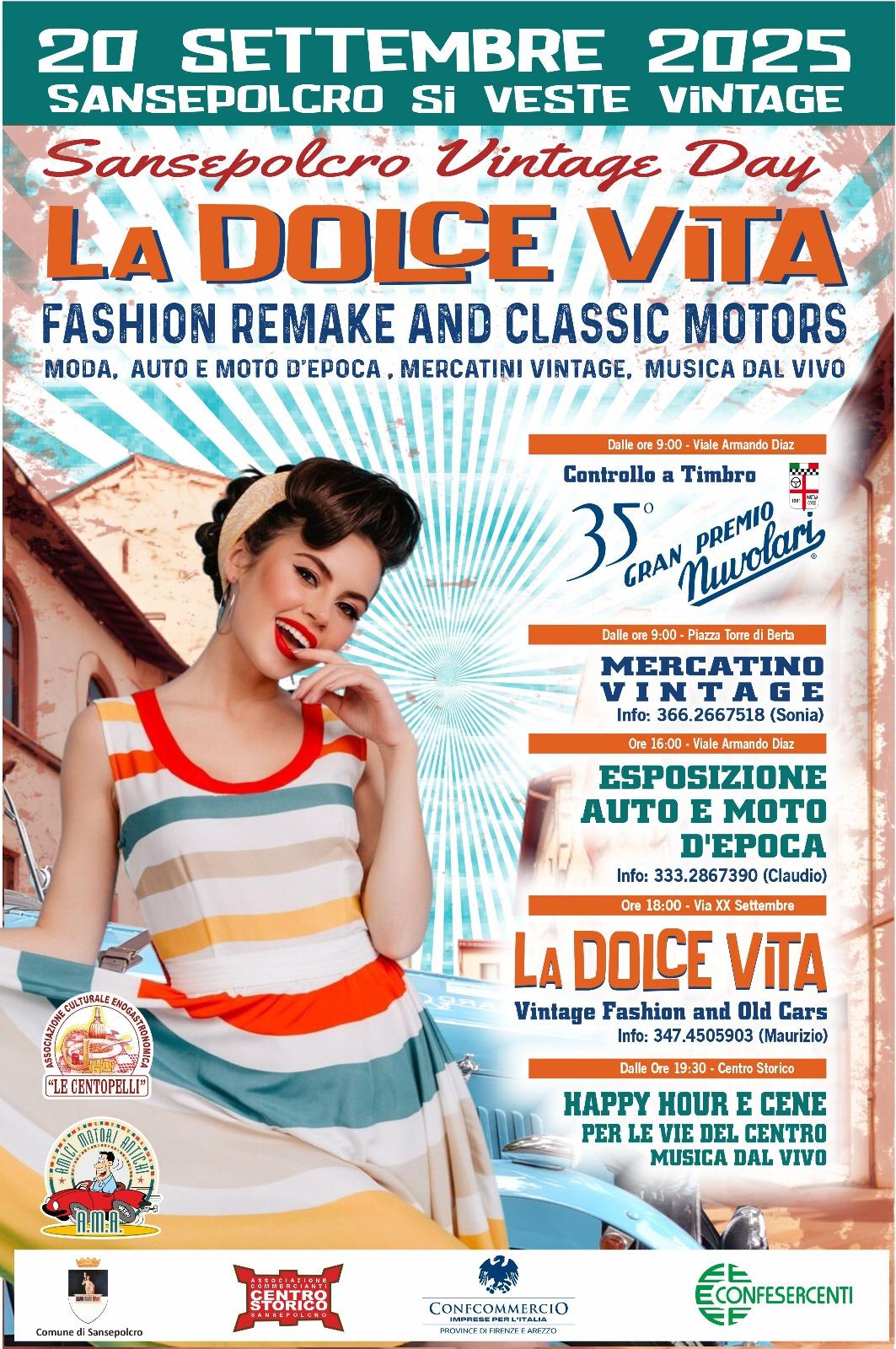 “La Dolce Vita – Vintage Day”, organizzato dall’Associazione Le Centopelli e Amici Motori Antichi, in collaborazione con il Comune di Sansepolcro, l’Associazione Commercianti del Centro Storico, Confesercenti e Confcommercio, è un’occasione speciale per immergersi nell’atmosfera del passato, rivivendo i colori, le emozioni e la raffinatezza di un’epoca che continua a ispirare generazioni.