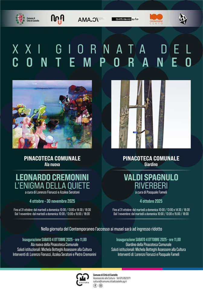 Sabato 4 ottobre 2025, inseriti nel programma della Giornata Nazionale del Contemporaneo indetta dal Ministero e da AMACI, in Pinacoteca alle ore 11:00 inaugureranno due eventi pensati per l’occasione: la mostra ai cento anni di Leonardo Cremonini “L’enigma della quiete”, a cura di Lorenzo Fiorucci e Azalea Seratoni, che sarà allestita presso l’Ala Nuova e l’installazione “Riverberi”, di Valdi Spagnulo, artista milanese tra i più significativi della scultura contemporanea italiana, ospitata negli spazi esterni della Pinacoteca.