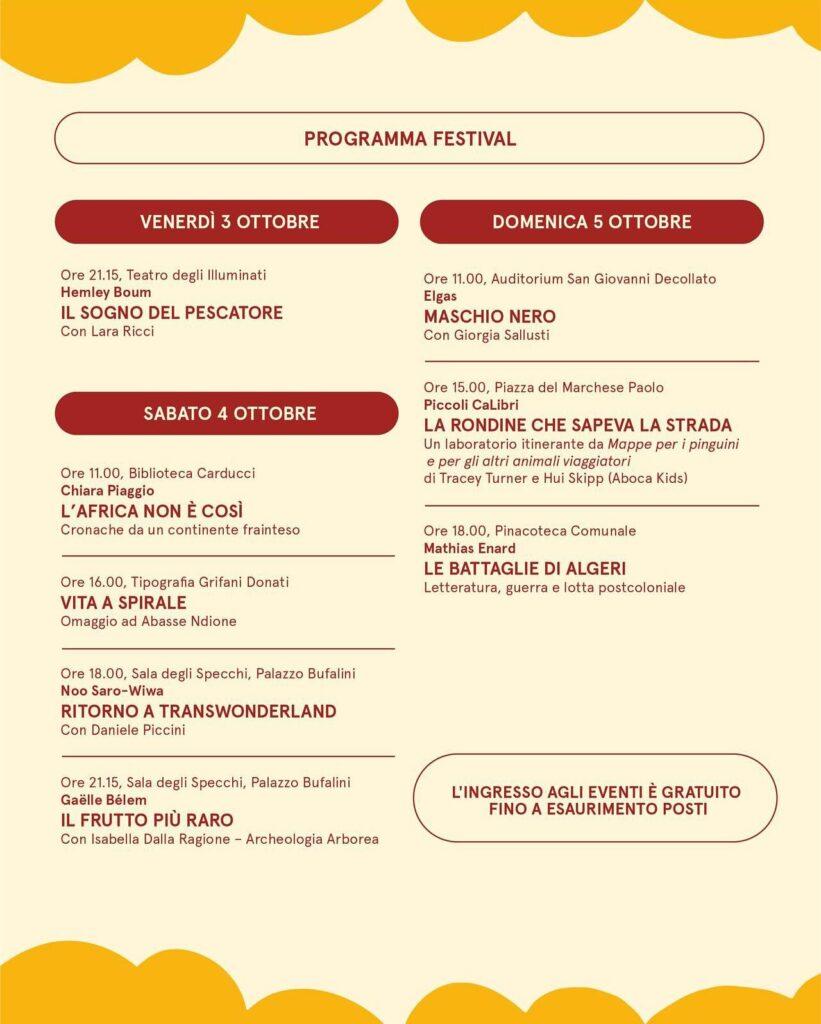 Da venerdì 3 ottobre al via la terza edizione di @CaLibro Africa, il festival dedicato alla letteratura africana con un ricco programma di iniziative. Venerdì 3 ottobre alle 21:15 presso il Teatro degli Illuminati, una conversazione su Il sogno del pescatore, di Hemley Boum con Lara Ricci; sabato 4 presso la Biblioteca Carducci ore 11:00 Chiara Piaggio con il suo nuovo libro; alle ore 16:00 appuntamento alla libreria Paci con un omaggio ad Abasse Ndione. Sempre sabato 4 a Palazzo Bufalini doppio appuntamento: alle ore 18:00 Noo Saro-Wiwa in dialogo con Daniele Piccini e alle 21:15 Gaëlle Bélem insieme a Isabella Dalla Ragione di Archeologia Arborea. Domenica 5 all’Auditorium San Giovanni Decollato Elgas dialoga con Giorgia Sallusti; alle ore 15:00 l’appuntamento è con Piccoli CaLibri che propone un laboratorio itinerante presso per le vie della città con partenza da Piazza del Marchese Paolo. Ultimo appuntamento domenica 5 presso la Pinacoteca alle ore 18:00 con Mathias Énard, uno dei più importanti scrittori internazionali, in una conferenza speciale preceduta da una visita guidata alle opere più importanti del museo in collaborazione con PoliedroCultura.