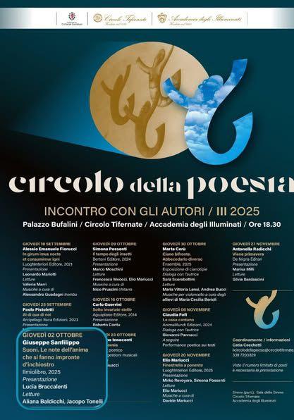 Terzo appuntamento del Circolo della Poesia giovedì 2 ottobre ore 18.30 al Circolo Tifernate Accademia degli Illuminati con Giuseppe Sanfilippo. Presentazione a cura di Lucia Braccalente e letture di Aliana Baldicchi e Jacopo Tonelli