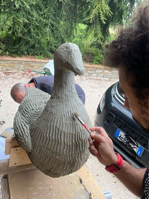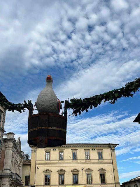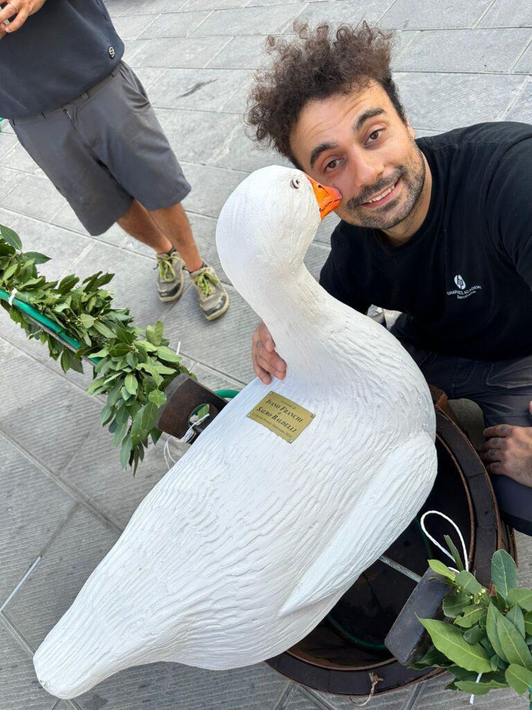 Città di Castello. Una nuova oca a prova d’arte per il secolare palio della Mattonata. Ora e’ rigorosamente “finta” (da sempre è’ stata viva e vegeta dentro il mastello pieno d’acqua) e sono passati ormai vent’anni da quando l’oca “contemporanea” del rione Mattonata prendeva vita per la prima volta, ma il tempo ha lasciato i suoi segni e così gli organizzatori sono dovuti intervenire per rifarne una nuova in ”bottega”. C’hanno pensato due noti artisti tifernati, Alberto Maria Ottaviani, consigliere della società rionale e Fabio Mariacci che si sono impegnati a ricostruire, questa piccola scultura che accompagna da sempre il Palio dell’Oca, la manifestazione più antica della città, fra le più longeve a livello regionale che si svolge ogni anno la prima domenica di Ottobre. E domenica scorsa l’oca ha debuttato al palio edizione 2025. La scultura è stata realizzata in polistirolo e poi rivestita con una malta cementizia, in modo da renderla resistente alle intemperie e al gioco del Palio. “Un lavoro che ho portato avanti insieme all’artista Fabio Mariacci, con il quale collaboro sempre per le creazioni scenografiche del rione”, precisa con un pizzico d’orgoglio, Alberto Ottaviani figlio “d’arte” che con il padre Gianni tramanda al futuro la tradizione plurisecolare de La Tipografia Grifani Donati, nata nel 1799, unica tra le aziende così antiche ad essere ancora oggi attiva e divenuta negli ultimi anni il punto di riferimento obbligatorio per la valorizzazione culturale del patrimonio tipografico a Città di Castello. “Questa nuova oca vuole essere anche un omaggio a due colonne portanti della Mattonata che ci hanno lasciato di recente: Ivano Franchi e Sauro Baldelli. Ho voluto che i materiali parlassero per loro: il polistirolo, leggero e modellabile, richiama la capacità che entrambi avevano di accogliere le persone con semplicità e apertura, adattandosi alle situazioni e facendo spazio a chiunque entrasse nella vita del rione. La malta cementizia, invece, che avvolge e protegge il cuore della scultura, simboleggia la solidità, la fermezza e la forza con cui hanno saputo tenere unito il gruppo e sostenere la nostra comunità. Un segno semplice – conclude Ottaviani- ma pieno di significato, per ricordare chi ha fatto tanto per il nostro rione.” Plauso da parte delle istituzioni, dal sindaco Luca Secondi e dalla giunta, “per questa bella iniziativa dei due bravi artisti che con la loro realizzazione contribuiscono a tenere in vita e rafforzare tradizioni secolari e simboli identitari di una comunità fiera di esibirli sempre”.” Città di Castello. Una nuova oca a prova d’arte per il secolare palio della Mattonata. Ora e’ rigorosamente “finta” (da sempre è’ stata viva e vegeta dentro il mastello pieno d’acqua) e sono passati ormai vent’anni da quando l’oca “contemporanea” del rione Mattonata prendeva vita per la prima volta, ma il tempo ha lasciato i suoi segni e così gli organizzatori sono dovuti intervenire per rifarne una nuova in ”bottega”. C’hanno pensato due noti artisti tifernati, Alberto Maria Ottaviani, consigliere della società rionale e Fabio Mariacci che si sono impegnati a ricostruire, questa piccola scultura che accompagna da sempre il Palio dell’Oca, la manifestazione più antica della città, fra le più longeve a livello regionale che si svolge ogni anno la prima domenica di Ottobre. E domenica scorsa l’oca ha debuttato al palio edizione 2025. La scultura è stata realizzata in polistirolo e poi rivestita con una malta cementizia, in modo da renderla resistente alle intemperie e al gioco del Palio. “Un lavoro che ho portato avanti insieme all’artista Fabio Mariacci, con il quale collaboro sempre per le creazioni scenografiche del rione”, precisa con un pizzico d’orgoglio, Alberto Ottaviani figlio “d’arte” che con il padre Gianni tramanda al futuro la tradizione plurisecolare de La Tipografia Grifani Donati, nata nel 1799, unica tra le aziende così antiche ad essere ancora oggi attiva e divenuta negli ultimi anni il punto di riferimento obbligatorio per la valorizzazione culturale del patrimonio tipografico a Città di Castello. “Questa nuova oca vuole essere anche un omaggio a due colonne portanti della Mattonata che ci hanno lasciato di recente: Ivano Franchi e Sauro Baldelli. Ho voluto che i materiali parlassero per loro: il polistirolo, leggero e modellabile, richiama la capacità che entrambi avevano di accogliere le persone con semplicità e apertura, adattandosi alle situazioni e facendo spazio a chiunque entrasse nella vita del rione. La malta cementizia, invece, che avvolge e protegge il cuore della scultura, simboleggia la solidità, la fermezza e la forza con cui hanno saputo tenere unito il gruppo e sostenere la nostra comunità. Un segno semplice – conclude Ottaviani- ma pieno di significato, per ricordare chi ha fatto tanto per il nostro rione.” Plauso da parte delle istituzioni, dal sindaco Luca Secondi e dalla giunta, “per questa bella iniziativa dei due bravi artisti che con la loro realizzazione contribuiscono a tenere in vita e rafforzare tradizioni secolari e simboli identitari di una comunità fiera di esibirli sempre”.