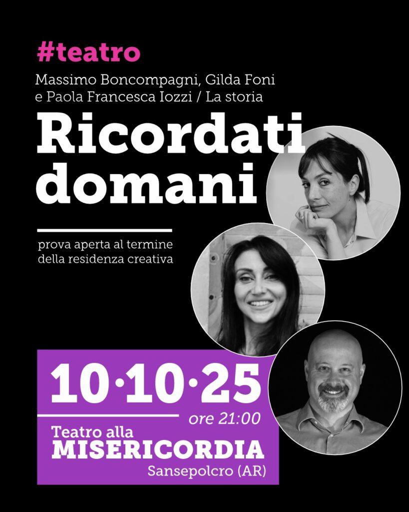 Un nuovo appuntamento al Teatro alla Misericordia di Sansepolcro – diretto dalla compagnia CapoTrave/Kilowatt – con le prove aperte al pubblico al termine del periodo di residenza creativa. In programma, venerdì 10 ottobre, alle 21.00, Ricordati domani, lavoro della compagnia La storia, scritto da Paola Francesca Iozzi, con Massimo Boncompagni diretto da Gilda Foni e dalla stessa autrice. Ricordati domani è un monologo intimo e struggente sul tema della memoria, dei ricordi, ma soprattutto sull’amore. Lo spettacolo racconta la storia di Dante nel giorno in cui dovrebbe dire addio ad Anna, sua moglie, malata di Alzheimer da dieci anni. Attraverso le fotografie, l’uomo sente riaffiorare ricordi, emozioni e dubbi, in un continuo andirivieni tra passato e presente. La presenza silenziosa di Anna aleggia dietro una porta chiusa, mentre la memoria trasforma lo spazio quotidiano in un fragile universo emotivo.