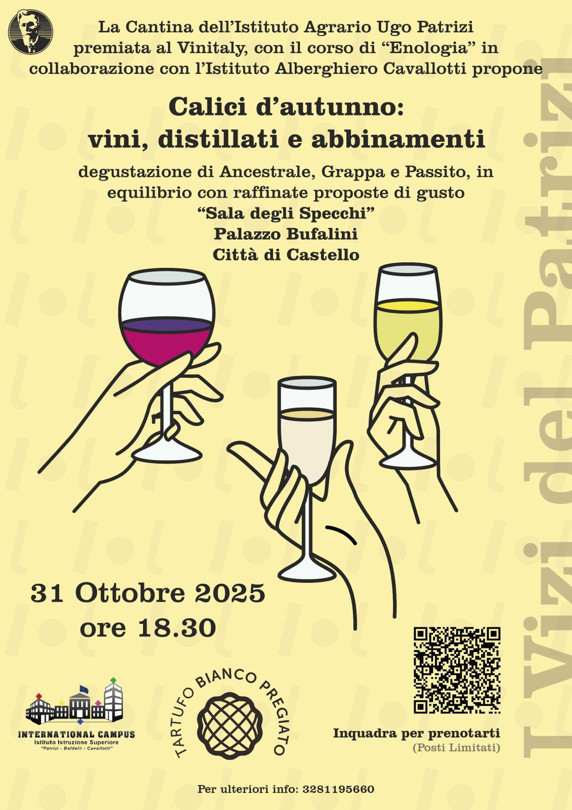 La Cantina dell’Istituto Agrario Ugo Patrizi. recentemente premiata al Vinitaly, con il corso di Enologia e in collaborazione con l’Istituto Alberghiero Cavallotti, propone una degustazione di ancestrale, grappa e passito, abbinati a raffinate proposte di gusto. Un’iniziativa che va ad unirsi ad altri eventi collaterali messi in programma dalla scuola in occasione dei 110 anni dalla fondazione della Scuola Agraria a Città di Castello. Un’occasione per celebrare una lunga tradizione di formazione tecnica agraria e valorizzare i prodotti e le competenze del territorio- La degustazione evento ” Calici d’autunno si terrà venerdì 31 ottobre alle 18.30, presso La Sala degli Specchi di Palazzo Bufalini. Questi gli abbinamenti della serata nati in sinergia con i docenti chef dell’indirizzo Enogastronomico del nostro International Campus Patrizi Baldelli Cavallotti e i in linea con i sapori delle manifestazioni autunnali cittadine, a partire dall’evento dedicato al Tartufo Bianco Pregiato, che vede il tartufo, al centro delle proposte locali.