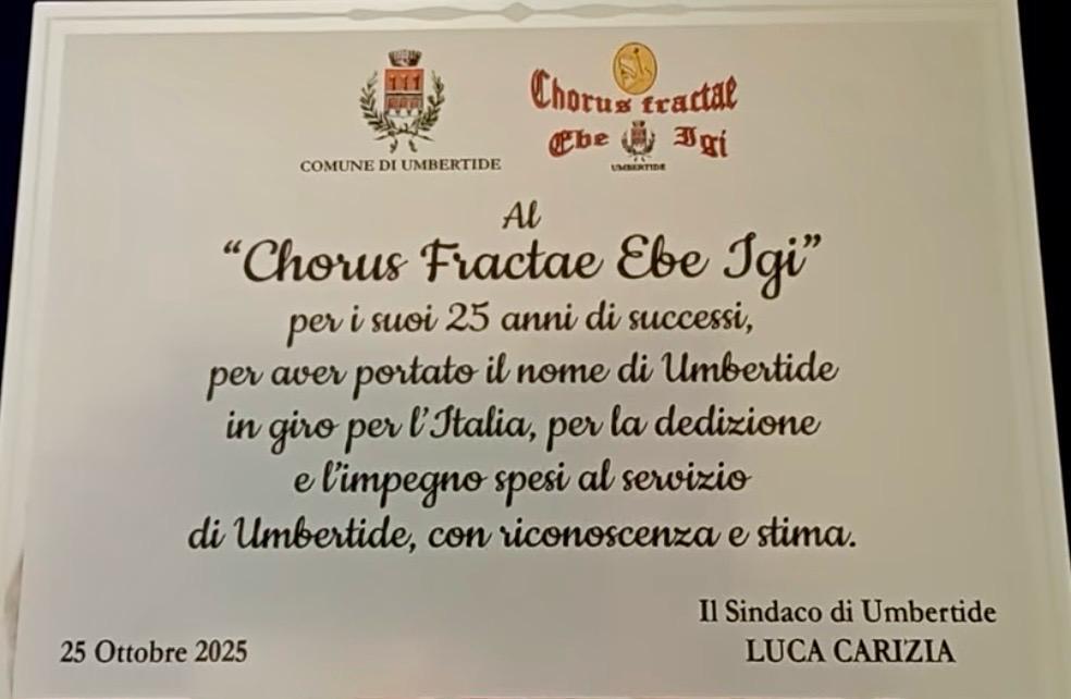“Al Chorus Fractae Ebe Igi per i suoi 25 anni di successi, per aver portato il nome di Umbertide in giro per l’Italia, per la dedizione e l’impegno spesi al servizio di Umbertide, con riconoscenza e stima.”