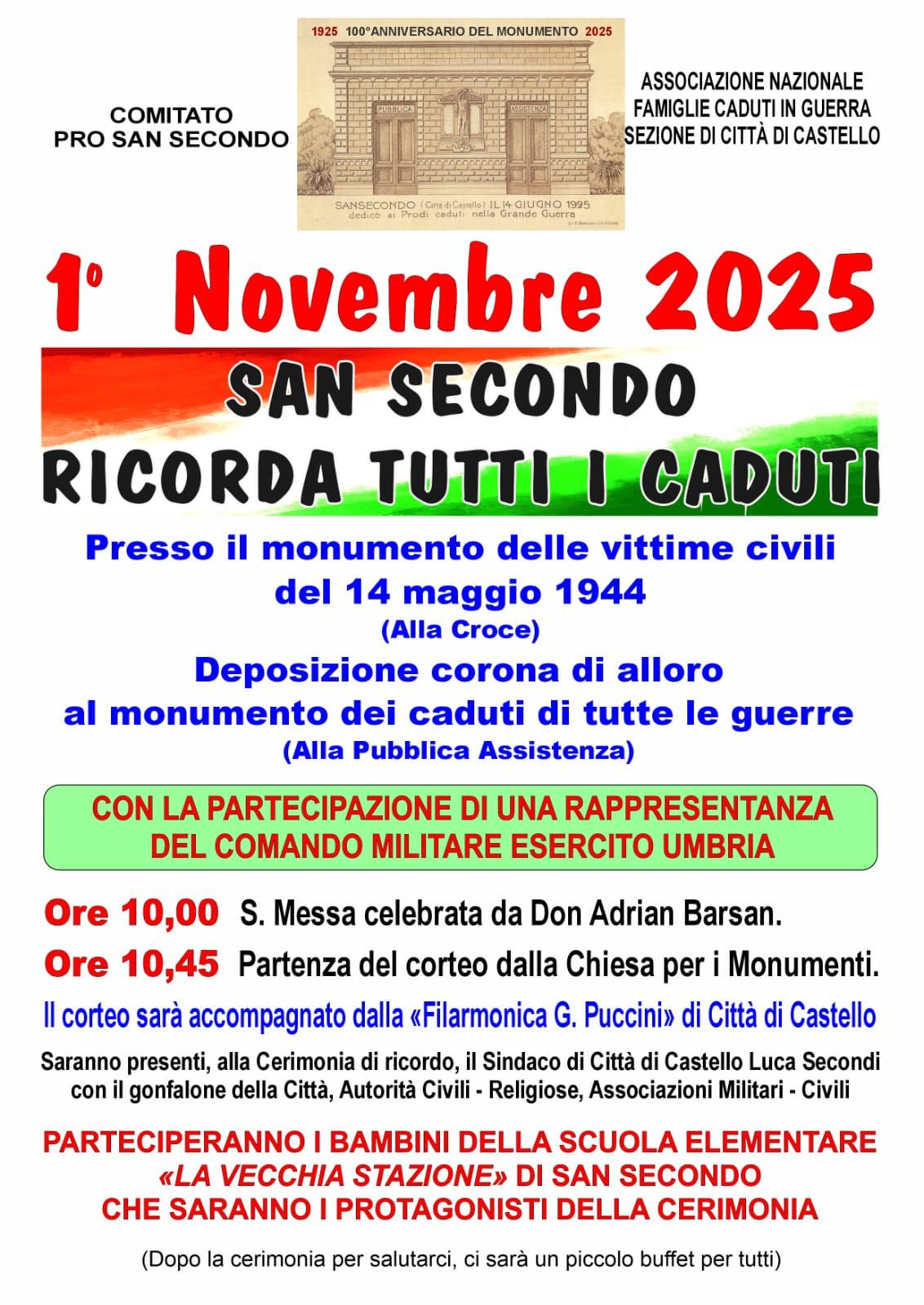 Sabato 1° novembre, nella frazione di San Secondo, si terrà la cerimonia di commemorazione dei Caduti in guerra (vittime civili e militari), promossa da Comitato Pro San Secondo ed Associazione Nazionale Famiglie Caduti e Dispersi in Guerra – Sezione di Città di Castello.