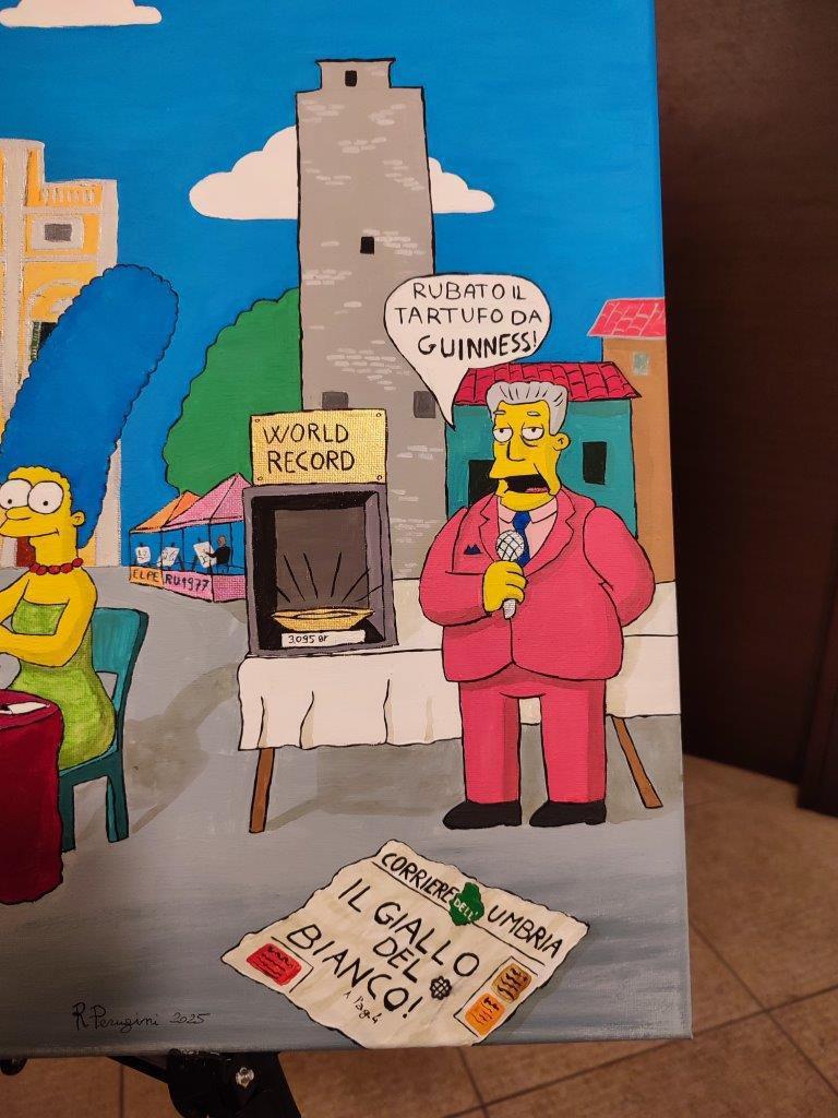 La mostra organizzata dall’associazione culturale “Gruppo Amici Arte e Ciao Umbria” e curata dal vicepresidente, Donatella Masciarri, resterà aperta al pubblico il 30 ottobre dalle 16 alle 19.30, venerdì 31 Ottobre, sabato 1 e domenica 2 novembre dalle 10 alle 13 e dalle 15.30 alle 20. Inoltre sabato 1 novembre dalle 9 del mattino fino alle 18, le piazze ospiteranno anche un estemporanea di pittura dal titolo “tuber magnatum” dove grandi artisti creeranno dal vivo le loro opere sul tema del grande protagonista del salone. “Una bella occasione in più per immergersi nei sapori e profumi del tartufo con uno sguardo all’arte e alla cultura che tanto caratterizzano Città di Castello”, commentano l’assessore al turismo e commercio, Letizia Guerri ed il presidente dell’Ente Fiera Salone Nazionale Bianco Pregiato, Lazzaro Bogliari. Il dipinto “Il giallo del bianco – Colpo grosso a Città di Castello” realizzato da Roberto Perugini, tifernate, 48 anni, progettista di attrezzature meccaniche per un’azienda che produce stampi per iniezione di materie plastiche con la passione per la pittura, è un acrilico su tela di dimensioni 70 x 50 cm. “Con questa opera – spiega Perugini – ho voluto omaggiare la nostra splendida piazza, inscenando un improbabile “crimine” a danno della mostra del tartufo che si terrà in concomitanza all’esposizione. Ho cercato di declinare la piazza in stile Simpson mantenendo però l’architettura (Torre Civica, campanile rotondo), gli scorci (in secondo piano i giardini del Cassero) e qualche pittoresco personaggio che caratterizza la vita di piazza. Il quadro non sarà incorniciato in quanto la scena ritratta si estende anche ai bordi, donando un effetto tridimensionale osservando l’opera da più angolazioni”, conclude l’artista che ha accostato la celebre famiglia dei serial Tv mondiali al tartufo, la prelibata trifola che si celebra a Città di Castello tutto l’anno.