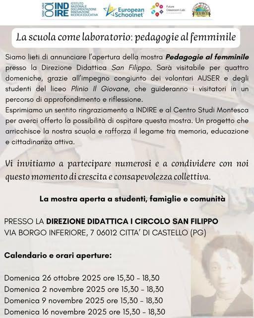 Direzione Didattica San Filippo: domenica 2 novembre 15:30 alle 18:30 apertura della mostra “La scuola come laboratorio: pedagogie al femminile” curata dalla Fondazione Centro Studi Villa Montesca. L’esposizione rende omaggio ad Alice Hallgarten Franchetti, figura visionaria e generosa,che ha intrecciato educazione, emancipazione e giustizia sociale, lasciando un’eredità pedagogica profonda e attualissima. La mostra ripropone anche il pannello presentato dai Baroni Franchetti all’Esposizione Universale e Internazionale di Bruxelles nel 1910.