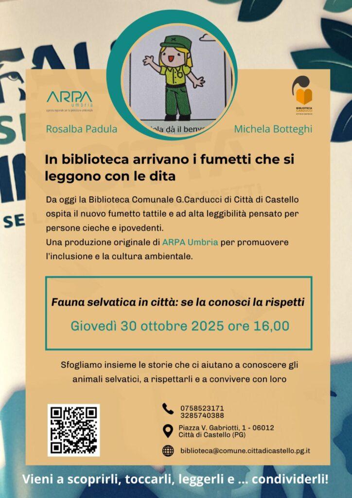 Giovedì 30 ottobre ore 16:00, Arpa Umbria in collaborazione con il comune di Città di Castello, presso la Biblioteca Carducci presenta uno speciale fumetto, pensato per ciechi e ipovedenti, dedicato alla conoscenza e al rispetto della fauna selvatica in città e nelle aree periurbane, con l’obiettivo di promuovere una cittadinanza più consapevole e inclusiva. Il fumetto, realizzato con linguaggi tattili e narrativi accessibili, racconta il delicato equilibrio tra uomo e natura nei contesti urbani.