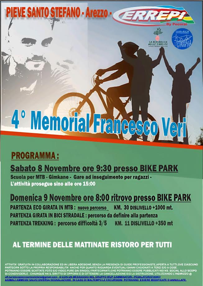 La due giorni, organizzata dal Team Errepi del Presidente Remo Pecorai, in collaborazione con la Proloco di Pieve, l’Ufficio Turistico e il Patrocinio del Comune di Pieve Santo Stefano, nell’ambito del progetto “La REPUBBLICA DELLE FORESTE” prevede al sabato presso il nuovo bike Park di Pieve Santo Stefano, a partire dalle ore 9.30 e fino al pomeriggio, scuola per Mountain Bike, gimkane e gare di inseguimento per ragazzi.