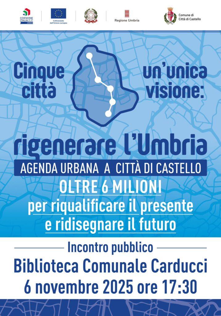 “Rigenerare l’Umbria – Agenda Urbana a Città di Castello” è il titolo dell’iniziativa pubblica che Regione Umbria e Comune promuoveranno giovedì 6 novembre, alle ore 17.30, presso la Biblioteca Comunale Carducci per presentare ai cittadini gli investimenti da oltre 6,7 milioni di euro nel tessuto urbano finalizzati a migliorare qualità della vita, sostenibilità e inclusione sociale. L’incontro pubblico, a ingresso libero, servirà ad aprire un dialogo con professionisti, scuole e mondo dell’associazionismo sui progetti destinati a costruire una città più verde, intelligente e accogliente, nel quadro del programma di intervento che su scala regionale coinvolgerà cinque comuni umbri. Trasformare Città di Castello, con l’idea di renderla più vivibile, inclusiva e sostenibile grazie ai fondi europei, è la sfida che sarà illustrata dagli interventi del vice presidente della giunta regionale e assessore con delega al coordinamento e all’attuazione di Agenda Urbana Tommaso Bori, del sindaco Luca Secondi e del vice sindaco con delega all’Urbanistica Giuseppe Stefano Bernicchi, della dirigente regionale del Servizio Programmazione generale e negoziata Cristiana Corritoro e della dirigente comunale Settore Assetto del Territorio e Urbanistica Marcella Mariani.