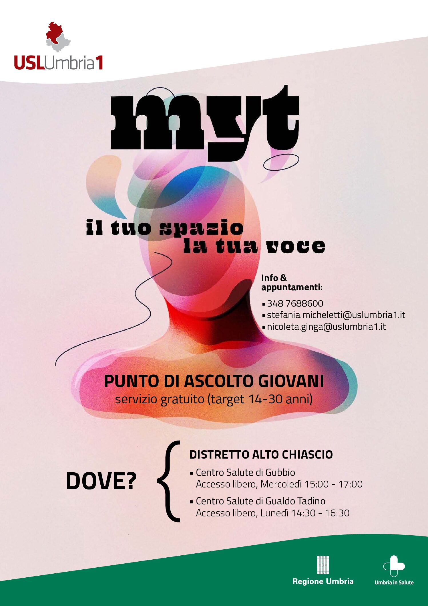 Distretto Alto Chiascio: Centro Salute di Gubbio (accesso libero, mercoledì 15,00–17,00); Centro Salute di Gualdo Tadino (lunedì 14,30–16,30). Info & appuntamenti: 348-7688600; stefania.micheletti@uslumbria1.it; nicoleta.ginga@uslumbria1.it.