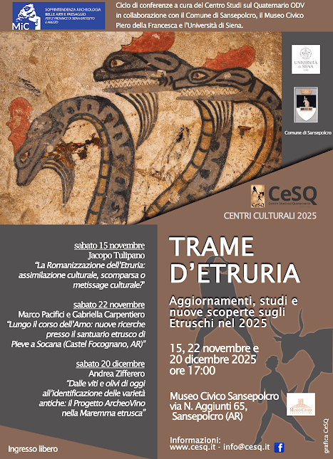 Tornano al Museo Civico di Sansepolcro gli appuntamenti dei Centri Culturali 2025, con il ciclo di incontri intitolato “Trame d’Etruria – Aggiornamenti, studi e nuove scoperte sugli Etruschi nel 2025”, a cura del Centro Studi sul Quaternario ODV (CeSQ) in collaborazione con il Comune di Sansepolcro, il Museo Civico Piero della Francesca e l’Università di Siena, con il patrocinio della Soprintendenza Archeologia, Belle Arti e Paesaggio per le province di Siena, Grosseto e Arezzo.