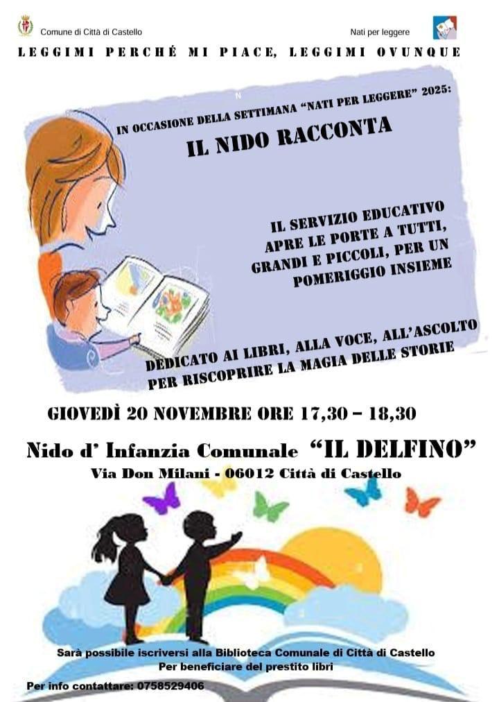“Nati per leggere”: giovedi 20 novembre dalle ore 17,30 alle ore 18,30 presso il nodo d’Infanzia comunale, “Il Delfino”, “Il nido racconta”, aperto a tutti, grandi e piccoli, per un pomeriggio insieme dedicato ai libri, alla voce