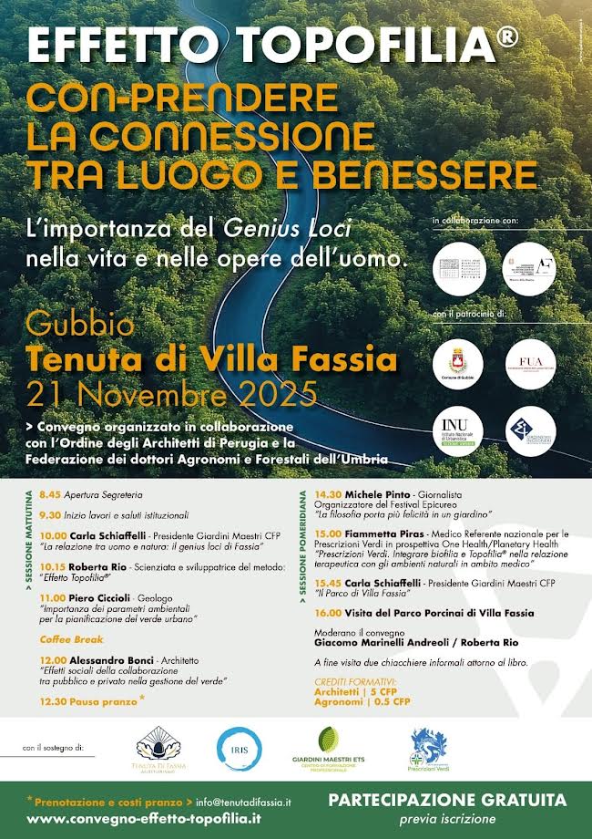 Mancano pochi giorni al primo Convegno italiano dedicato al metodo Effetto Topofilia® . Èintitolato Effetto Topofilia®. Con-prendere la connessione tra luogo e benessere. L’importanza del Genius Loci nella vita e nelle opere dell’uomo e si terrà venerdì 21 novembre, nella prestigiosa Villa di Fassia a Ponte d’Assi, alle porte di Gubbio.