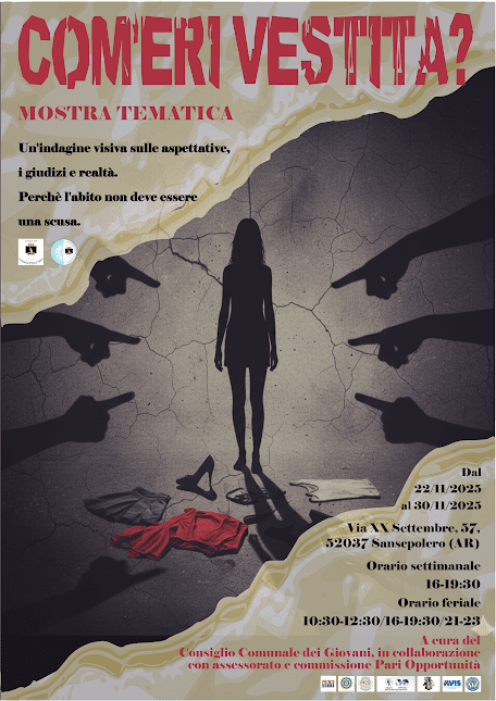 Nell’ambito delle iniziative promosse dal Comune di Sansepolcro in occasione della Giornata internazionale per l’eliminazione della violenza sulle donne, apre al pubblico la mostra tematica “Com’eri vestita?”, visitabile dal 22 al 30 novembre in Via XX Settembre al civico 57.