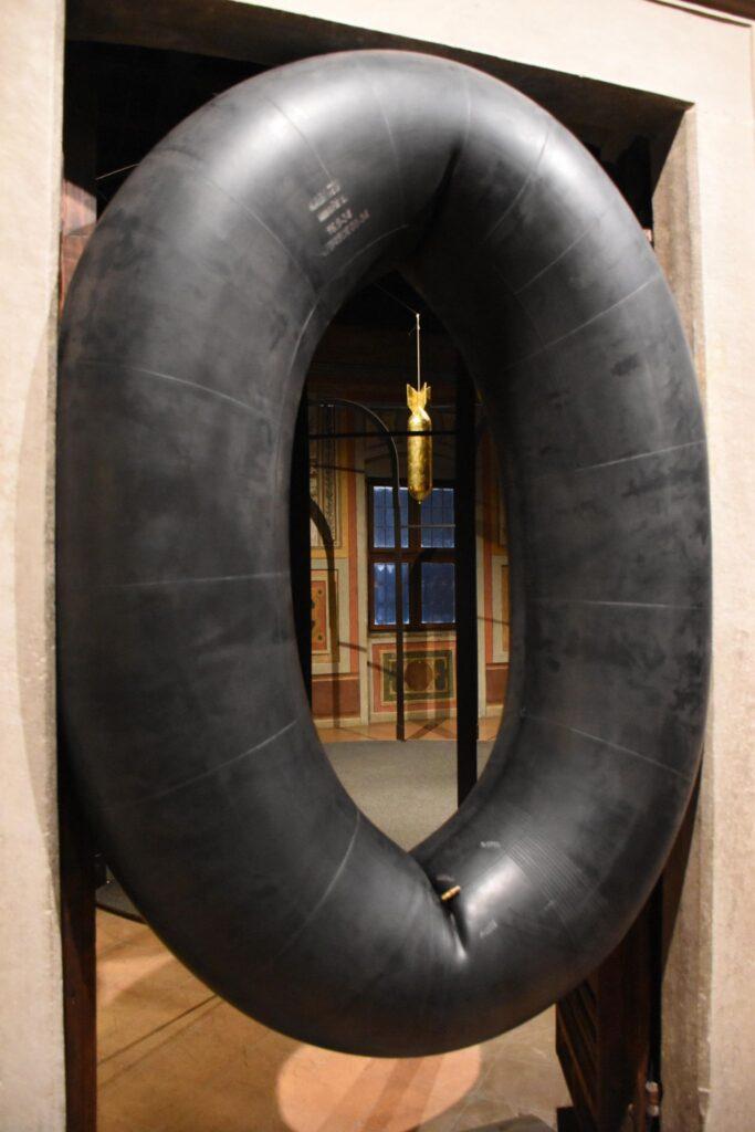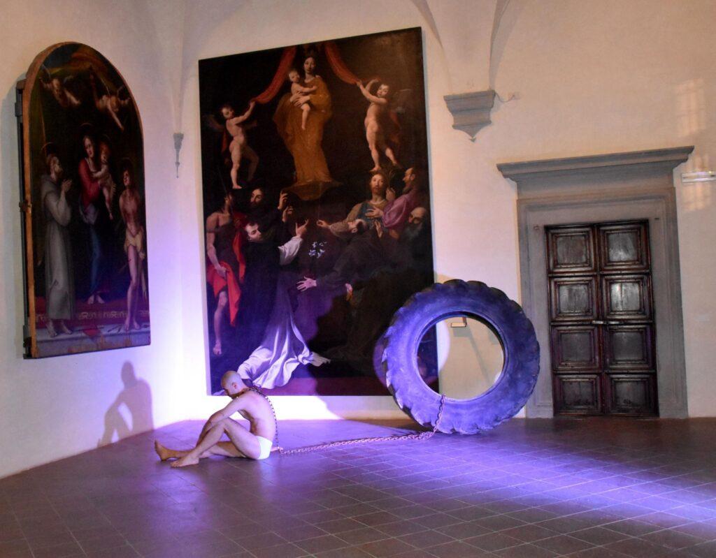Il titolo della mostra, “God Year”, riprende ironicamente il nome e il logo di una celebre industria di pneumatici, evocando al tempo stesso l’idea di Giubileo e di rinnovamento spirituale. In Umbria, terra di santi e di spiritualità, questo riferimento acquista un valore amplificato: la mostra si muove sul confine tra sacro e profano, fede e consumo, materia e spirito, elementi costitutivi della poetica di Canevari:le opere poste in dialogo con i capolavori della collezione rinascimentale, costruiscono un percorso immersivo in cui la materia, privata della sua funzione originaria, si carica di nuove valenze simboliche. Ogni sala della Pinacoteca diventa un luogo di meditazione sul rapporto tra arte, storia e contemporaneità, dove il linguaggio dell’artista offre una nuova lettura del patrimonio e restituisce al pubblico una rinnovata percezione del museo