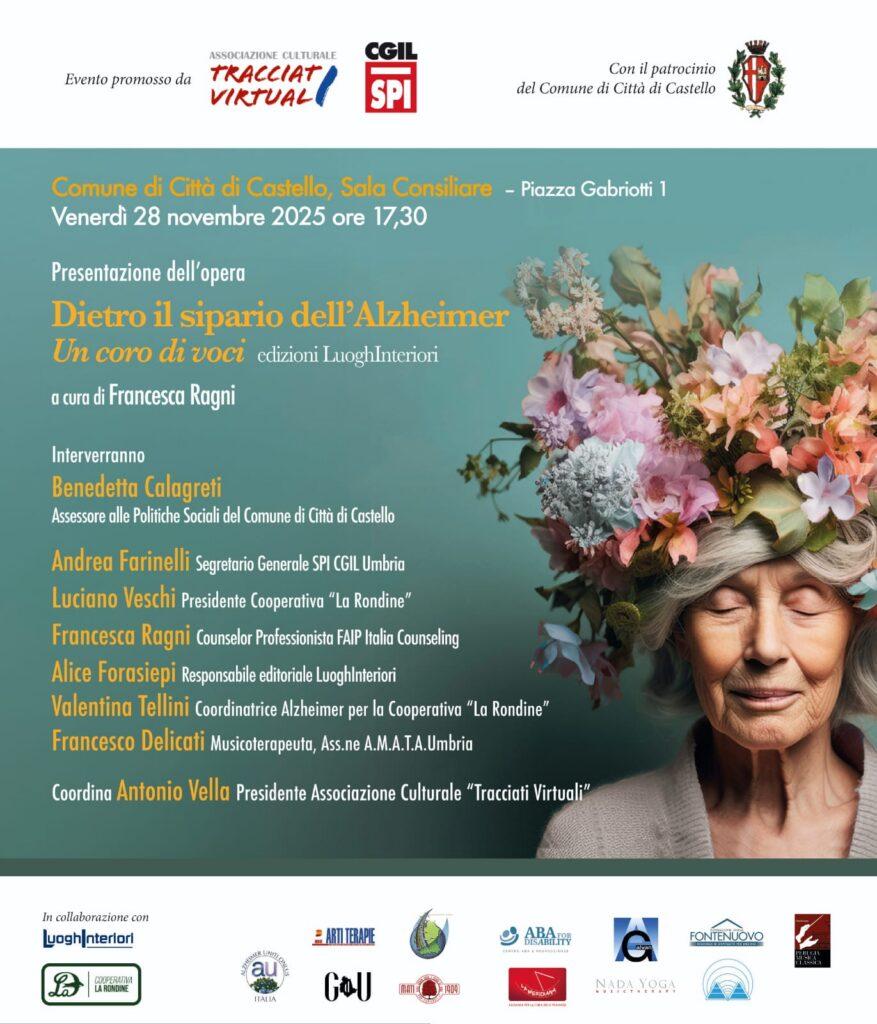 Dopo gli appuntamenti di Roma alla Camera dei Deputati e dell’Università per gli Stranieri di Perugia, sarà il Comune di Città di Castello a ospitare un evento dedicato a Dietro il sipario dell’Alzheimer – Un coro di voci, pubblicazione curata dalla counselor Francesca Ragni e edito dalla casa editrice tifernate LuoghInteriori.