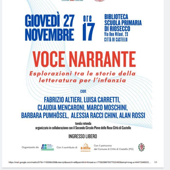 Giovedì 27 novembre 2025, alle ore 17:00, la Scuola Primaria di Riosecco, parte del Secondo Circolo Didattico di Città di Castello, con il patrocinio del Comune di Città di Castello, ospiterà un evento di grande rilievo culturale: “Voce Narrante – Esplorazioni tra le storie della letteratura per l’infanzia”.