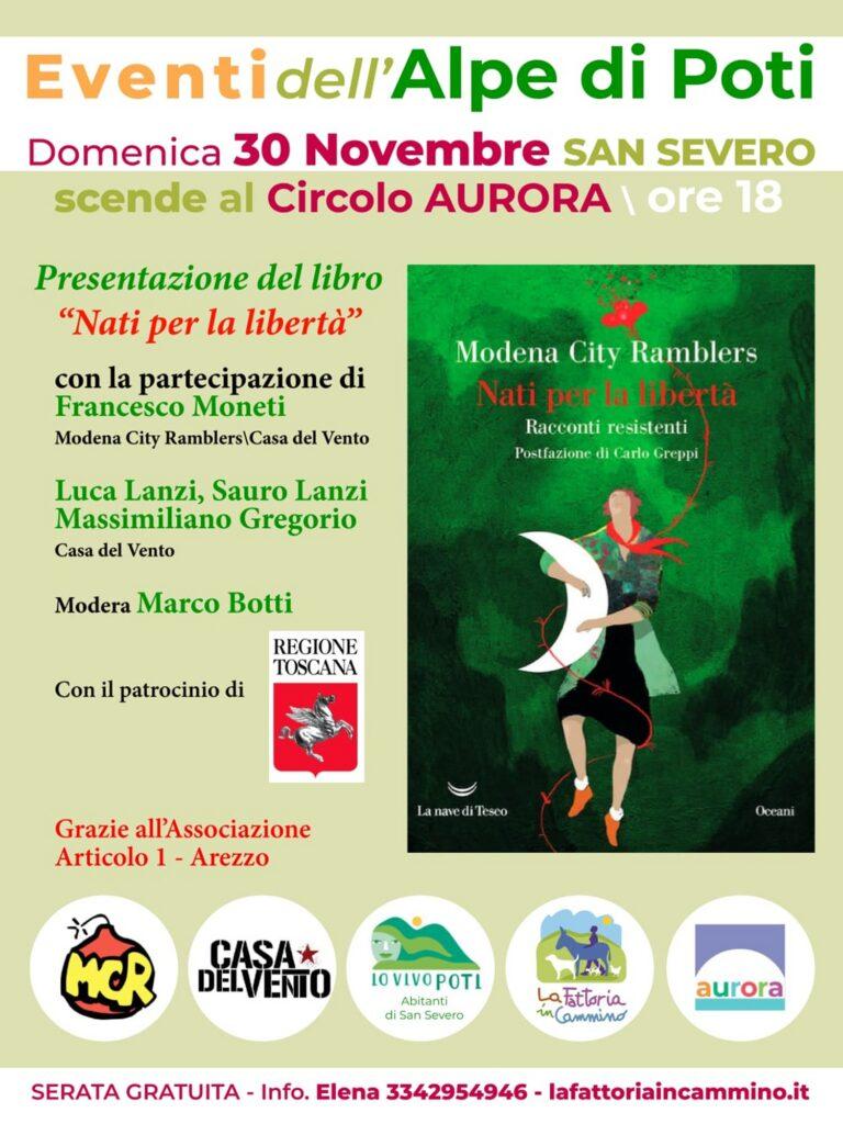 AREZZO – Per il calendario “Eventi dell’Alpe di Poti”domenica 30 novembre 2025, alle ore 18, il Circolo Aurora di piazza Sant’Agostino, ad Arezzo, ospita la presentazione di “Nati per la libertà. Racconti resistenti” (Edizioni La nave di Teseo), libro dei Modena City Ramblers, storica band modenese, che racconta alcuni fatti della Resistenza, tra i quali la strage nazifascista di San Severo.