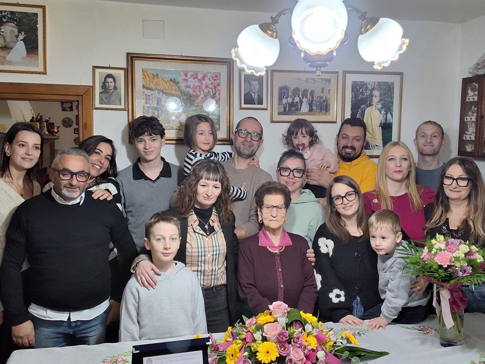 Centenaria al vertice di una famiglia da guinness dei primati. Ha spento 100 candeline sulla torta di compleanno, Nella Frontini, stretta nel caloroso abbraccio di 23 persone, fra figli, nipoti, bisnipoti e trisnipoti – Il sindaco Luca Secondi oggi gli ha consegnato una targa ufficiale