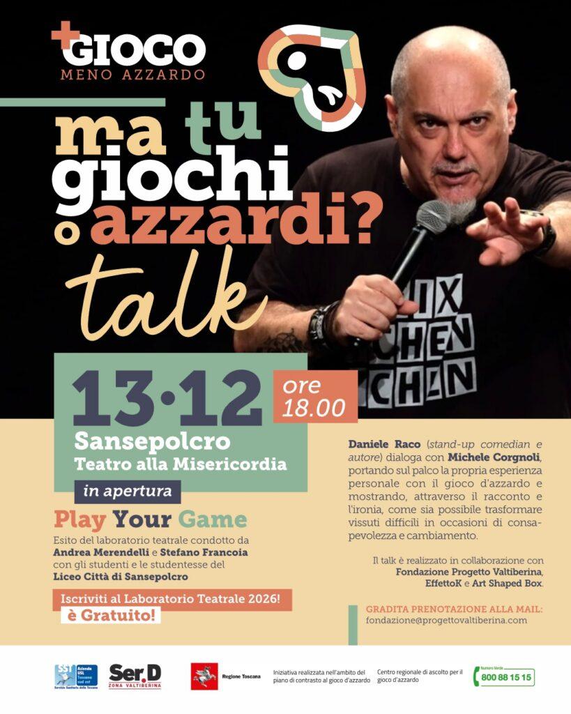 Il secondo appuntamento è previsto venerdì 13 dicembre al Teatro alla Misericordia, sempre a Sansepolcro, alle ore 18. In programma “Ma tu giochi o azzardi? TALK” con Daniele Raco, stand-up comedian e autore. Raco dialogherà con Michele Corgnoli, portando sul palco la propria esperienza personale con il gioco d’azzardo e mostrando, attraverso il racconto e l’ironia, come sia possibile trasformare vissuti difficili in occasioni di consapevolezza e cambiamento. Il talk è realizzato in collaborazione con Progetto Valtiberina, Effetto K e Artshapedbox. Ingresso gratuito con prenotazione scrivendo a fondazione@progettovaltiberina.com.