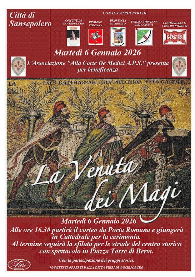 Il 6 gennaio 2026 Sansepolcro rinnova uno degli appuntamenti più sentiti e suggestivi del periodo natalizio con La Venuta dei Magi, evento simbolico che unisce tradizione storica, partecipazione cittadina e solidarietà.