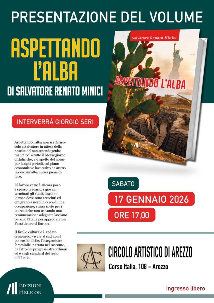 AREZZO – Sabato 17 gennaio 2026, alle ore 17.45, il Circolo Artistico di Corso Italia 108, ad Arezzo, ospita la presentazione del volume “Aspettando l’alba” (Edizioni Helicon) di Salvatore Renato Minici. Interverrà per l’occasione Giorgio Seri. L’ingresso è gratuito.