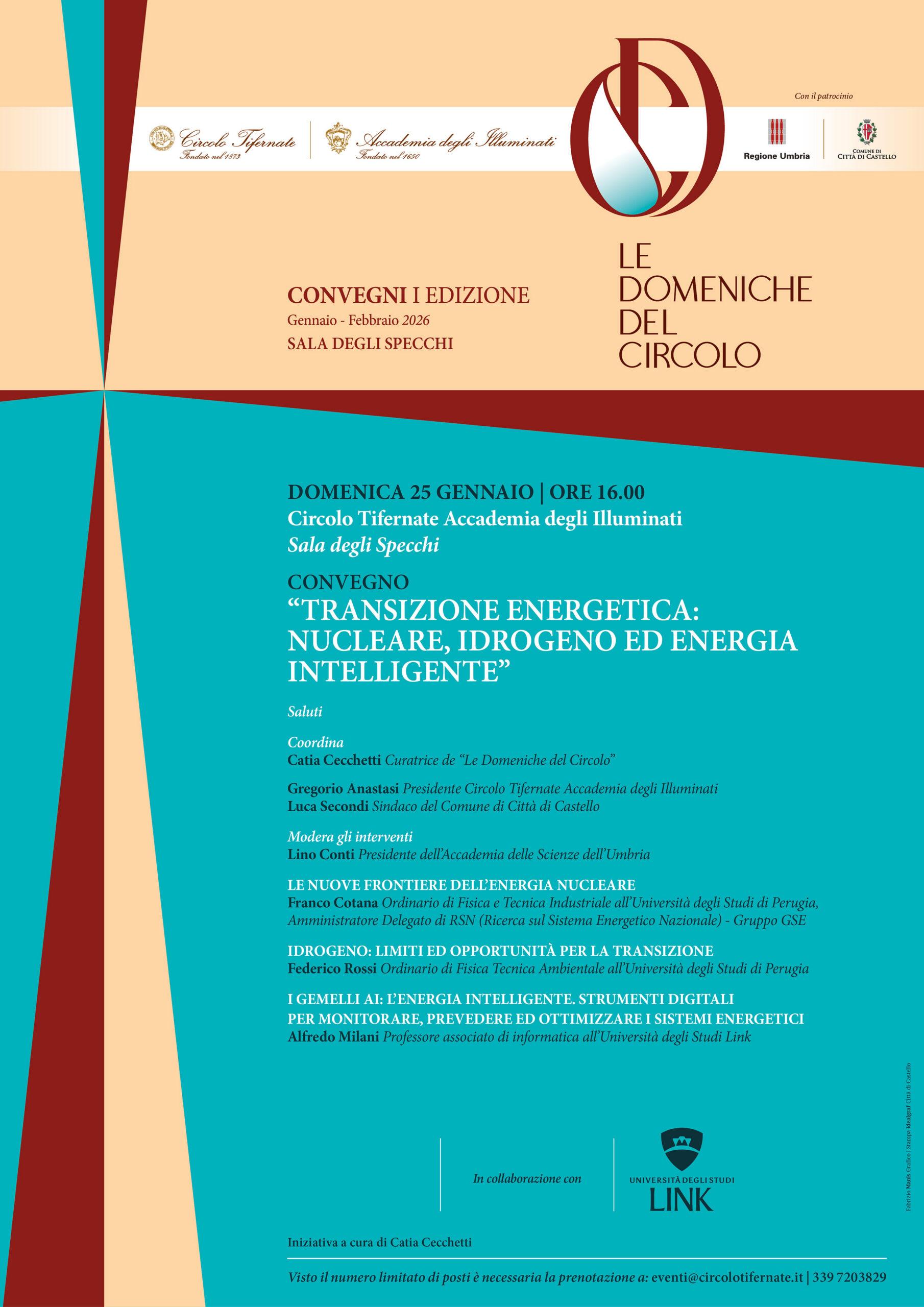 “Transizione energetica: nucleare, idrogeno ed energia intelligente” al Circolo Tifernate. Domenica 25 gennaio alle 16.00, con relatori di alto livello scientifico. Partecipazione gratuita, prenotazione obbligatoria