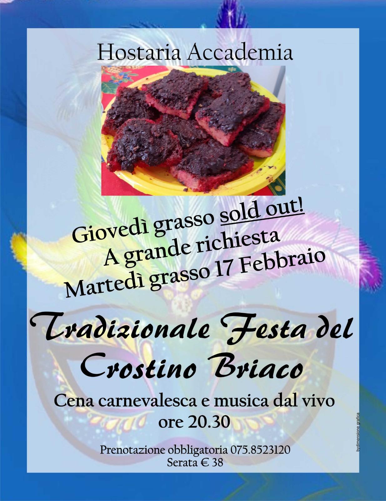 La tradizionale Festa del’Crostino ‘briaco’ organizzata il giovedì grasso(quest’anno il 12 febbraio) riprendendo la consuetudine riportata in auge anni fa dall’allora Accademia del Cioccolato, ha registrato in poche ore un sold-out eccezionale,al punto che gli organizzatori sono stati costretti a replicare a grande richiesta la serata all’Hostaria “Accademia” con le stesse modalità (cena carnevalesca e musica dal vivo) per il 17 martedì di fine Carnevale.