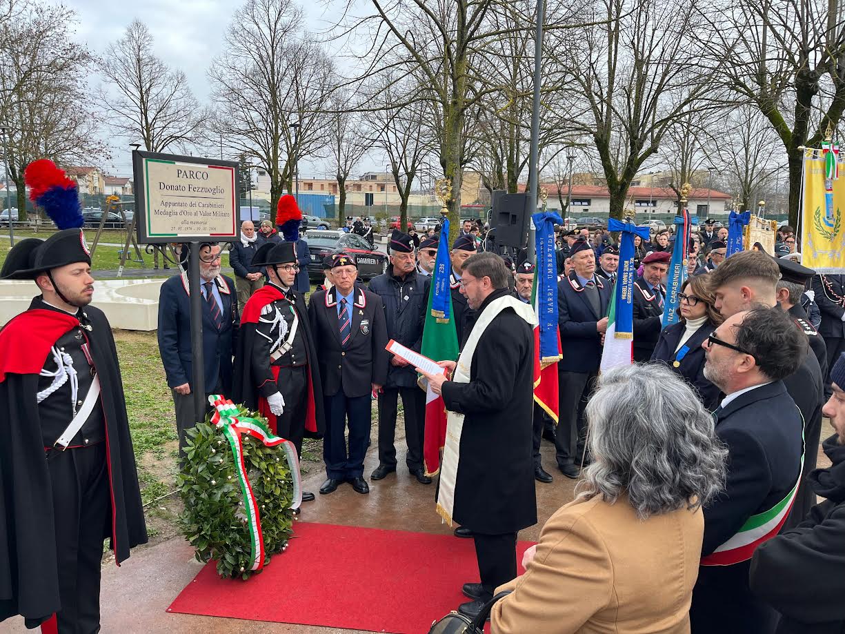 La cerimonia ufficiale ha avuto inizio alle ore 10.10 in via Cesare Battisti, dove il Parco situato nei pressi del campo sportivo USU è stato ufficialmente intitolato a Donato Fezzuoglio. Qui le massime autorità civili, militari e religiose del territorio, insieme a studenti e cittadini umbertidesi, si sono strette attorno ai familiari del carabiniere.