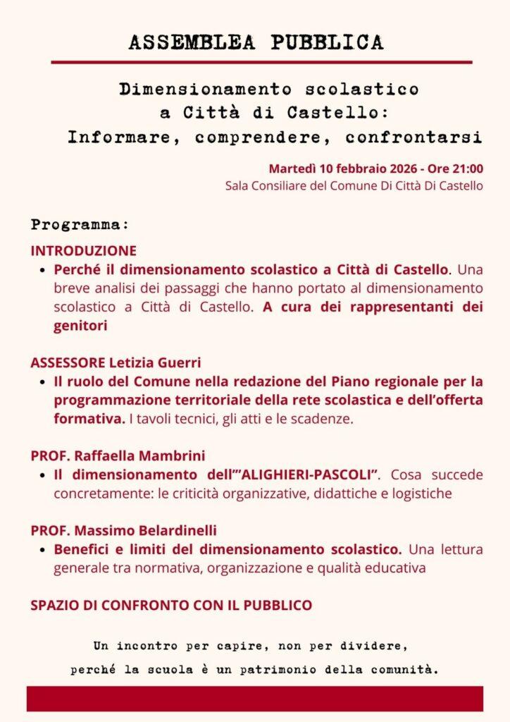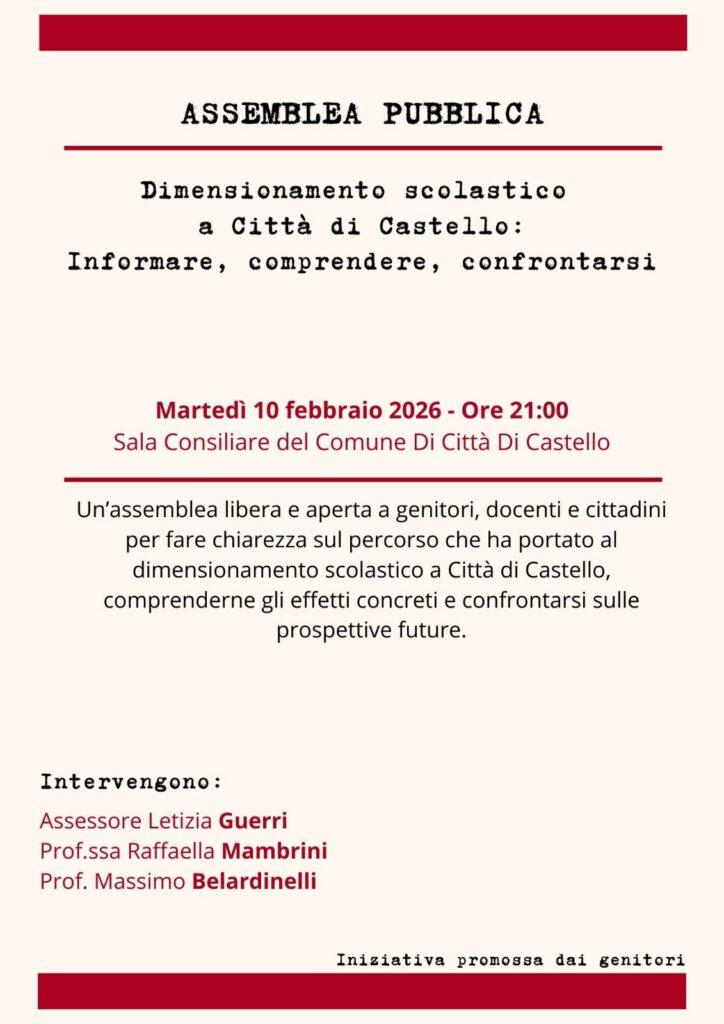 Fare chiarezza sulle decisioni istituzionali e tutelare il futuro della scuola: è con questo obiettivo che si terrà a Città di Castello martedì 10 febbraio alle 21:00 presso la Sala del Consiglio Comunale l’assemblea pubblica promossa dal comitato dei genitori. Al centro del dibattito, il piano di dimensionamento scolastico che ha scosso la comunità locale, portando alla raccolta di oltre 3.200 firme a testimonianza di una preoccupazione diffusa e trasversale.