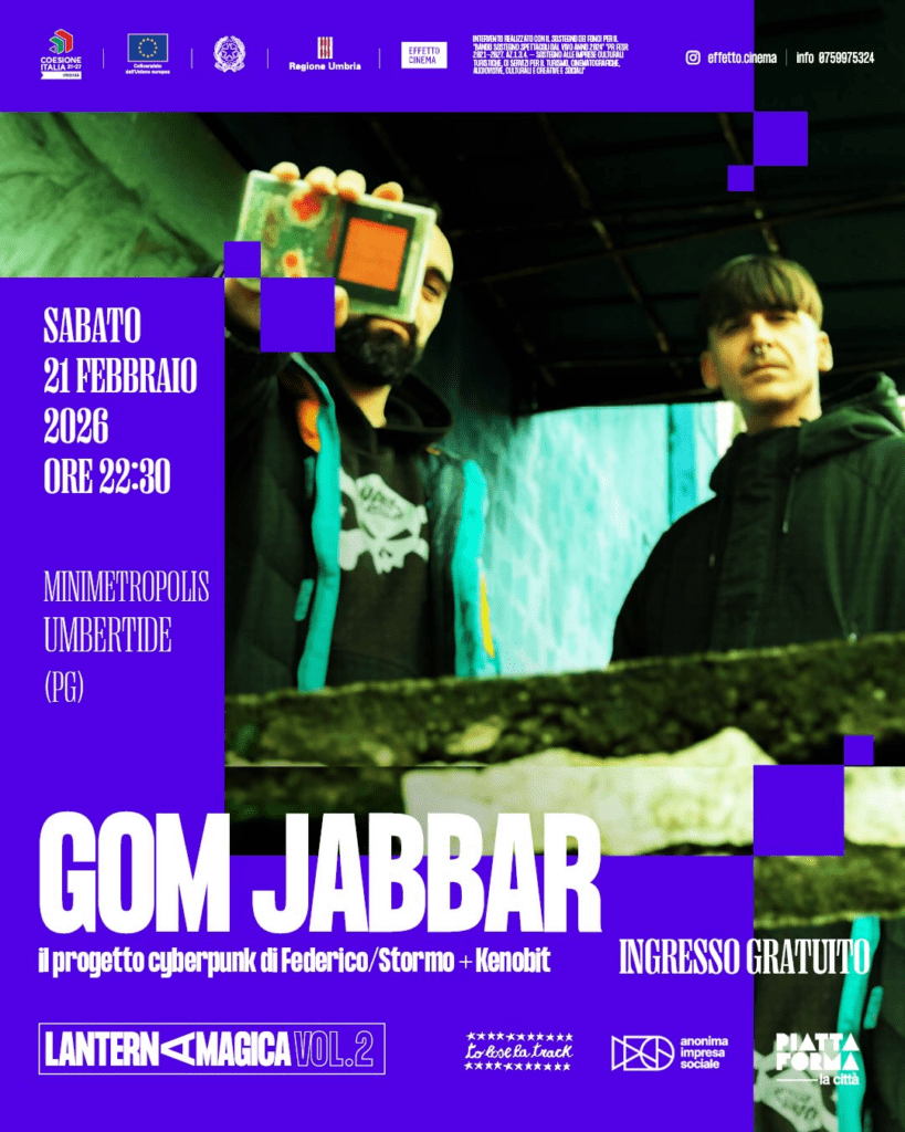 Alle 22.30, a ingresso gratuito, il MiniMetropolis ospiterà invece il concerto dei GOM JABBAR, duo cyberpunk nato dall’incontro tra Federico Trimeri (Stormo) e lo stesso Fabio Bortolotti (Kenobit). Il progetto unisce un Game Boy suonato dal vivo, senza filtri, a una chitarra distorta, dando vita a uno show essenziale, diretto e d’impatto, dal forte contenuto politico e sonoro.