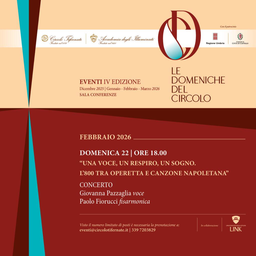 Nell’ambito della IV edizione de Le Domeniche del Circolo, domenica 22 febbraio alle ore 18.00 il Circolo Tifernate Accademia degli Illuminati ospiterà il concerto “Una voce, un respiro, un sogno – L’800 tra operetta e canzone napoletana”.