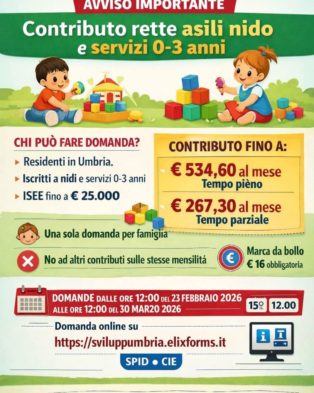 La Regione Umbria ha attivato un contributo economico destinato a sostenere le famiglie nel pagamento delle rette dei servizi educativi per l’infanzia (0–3 anni), riferito al periodo settembre 2025 – gennaio 2026 (anno educativo 2025/2026), con risorse del Fondo Sociale Europeo Plus (FSE+).
