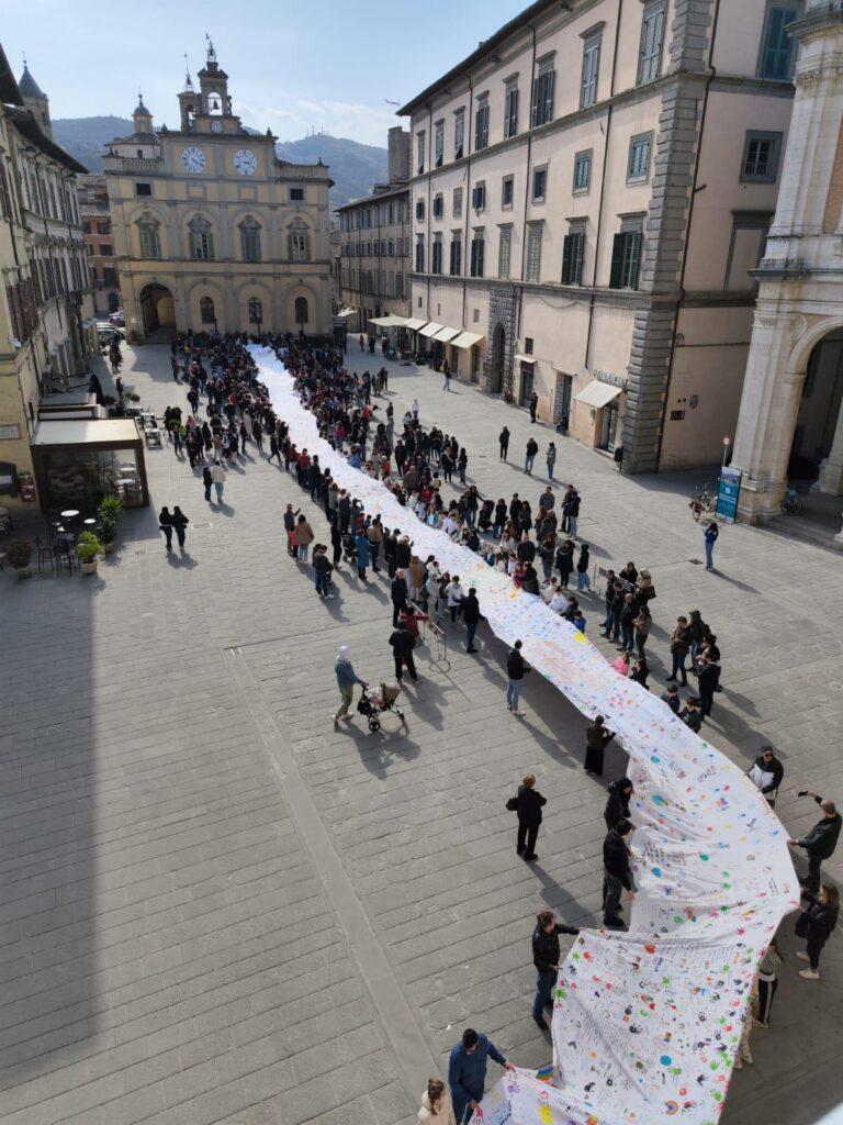«È stata una grande emozione donare la mia opera  “L’impronta dell’umanità” alla città di Assisi, che amo da sempre» ha dichiarato Moira Lena Tassi. «Ringrazio il Sindaco Valter Stoppini per aver accolto il 12 ottobre la Eco-Bandiera Collettiva della Pace più lunga del mondo, un progetto internazionale nato all’Open Air Museum Italo Bolano di Portoferraio e cresciuto nel tempo, pezzo dopo pezzo, celebrata dapprima lo scorso anno il 21 aprile  a Città di Castello con il coinvolgimento di tutte le scuole elementari e medie del territorio. È stata interamente realizzata con lenzuola bianche riciclate — anche quelle dei corredi della nonna — la bandiera è diventata un’ immensa opera d’arte collettiva capace di parlare tutte le lingue del mondo. Ringrazio inoltre il Sindaco Nicola Canawati per la partecipazione e annuncio con gioia che i nuovi segmenti realizzati dai bambini di Betlemme sono già arrivati e saranno presto esposti».