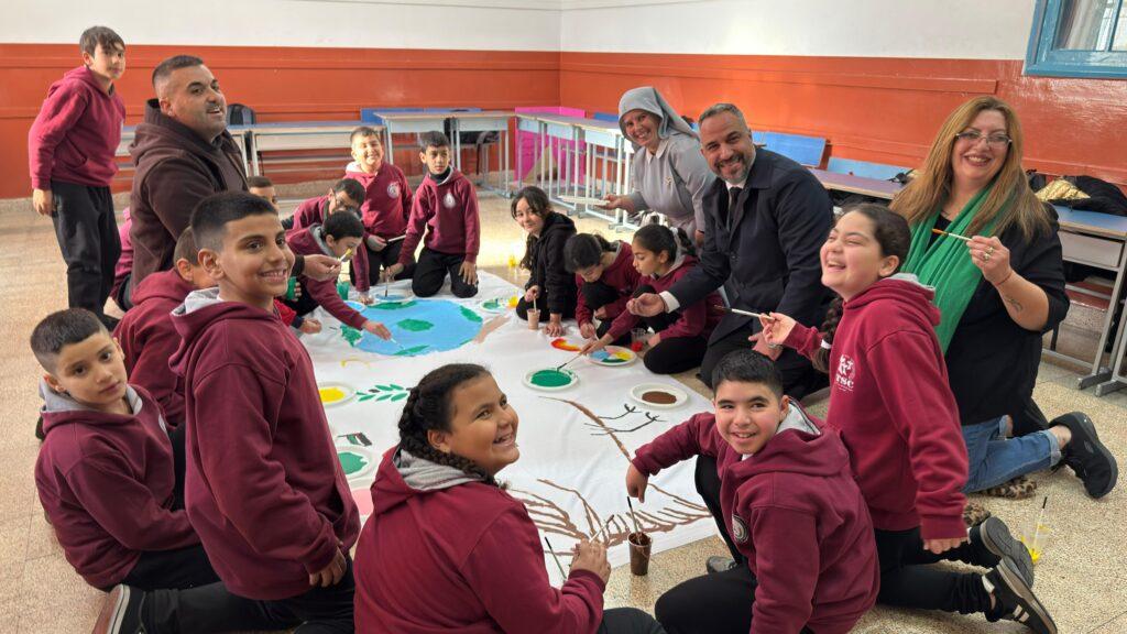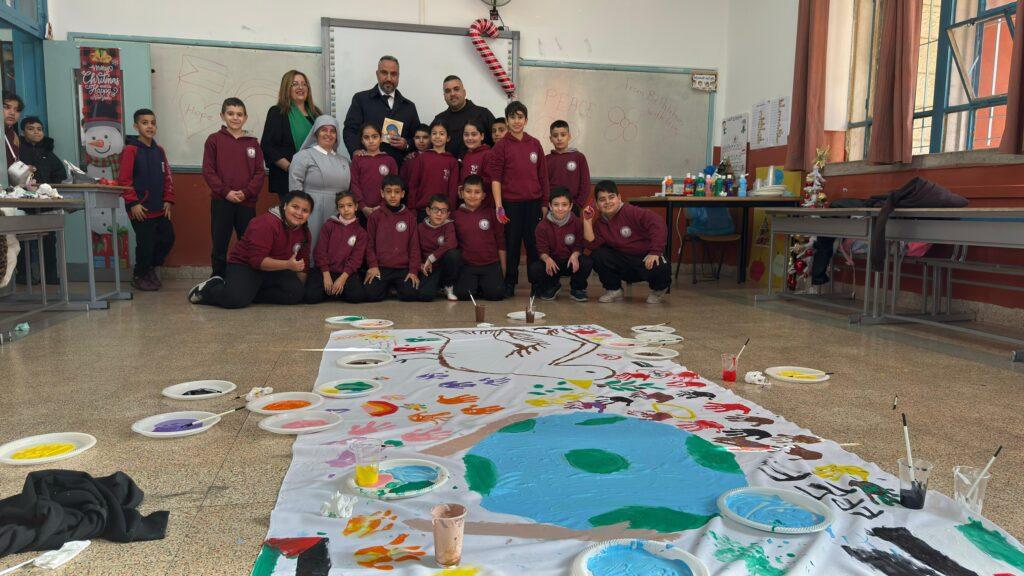 Durante l’esposizione ad Assisi, la Eco-Bandiera si è arricchita anche dei messaggi di pace e fratellanza scritti personalmente dal Sindaco di Assisi e dal Sindaco di Betlemme Nicola Canawati, gesto che ha rafforzato il respiro internazionale dell’iniziativa. Colpito dalla forza del progetto, il primo cittadino palestinese ha promosso la partecipazione dei bambini della scuola  “Terra Santa School Bethlehem”: venti giovanissimi studenti hanno realizzato due nuovi frammenti di bandiera, colorati con i segni della pace e dell’amore, destinati ad arricchire la monumentale opera d’ arte collettiva. Grazie al loro contributo la Eco-Bandiera della pace raggiungerà la lunghezza di oltre 150 metri.