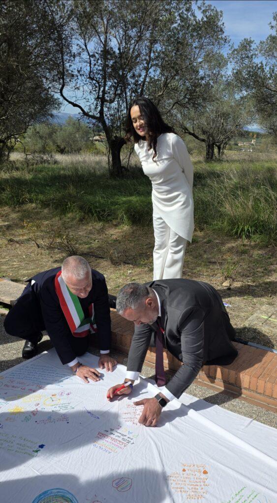 La consegna ufficiale si è svolta nella suggestiva cornice di Palazzo dei Priori, alla presenza del Sindaco Valter Stoppini, della Vice Sindaca Veronica Cavallucci e dell’Assessora Francesca Corazzi, che hanno espresso gratitudine e apprezzamento per un dono capace di intrecciare arte, memoria e impegno civile.
