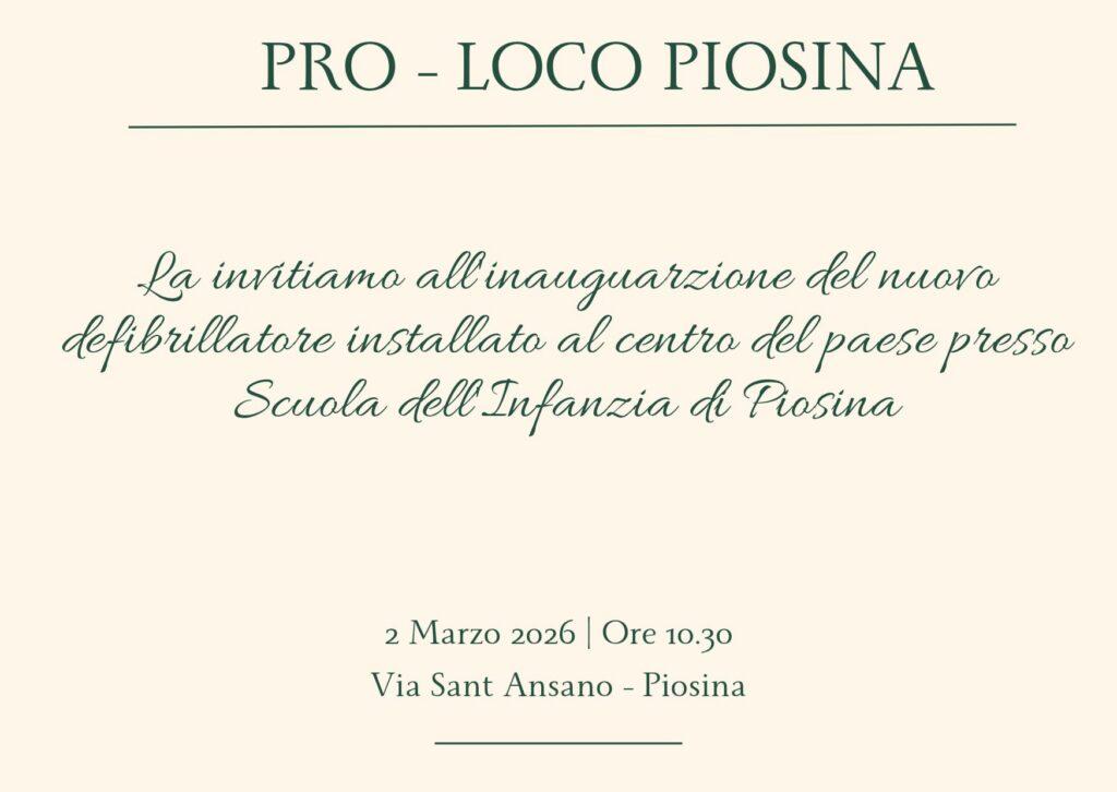 La Pro Loco Piosina invita la cittadinanza all’inaugurazione del nuovo defibrillatore installato nel centro del paese, presso la Scuola dell’Infanzia di Piosina.