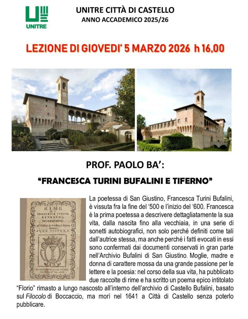 Il Prof. Paolo Ba’, profondo conoscitore della poetessa Francesca Turini Bufalini, terrà una lezione dal titolo: