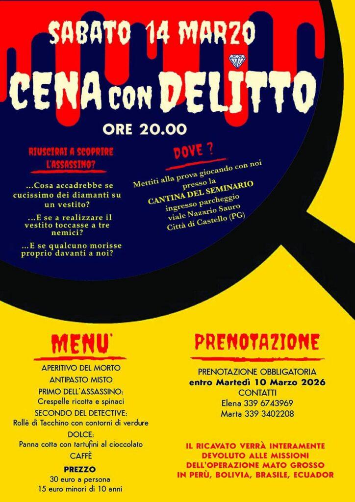 Una serata tra divertimento, mistero e solidarietà. Sabato 14 marzo alle ore 20, nella Cantina del Seminario di Città di Castello (ingresso dal parcheggio di Viale Nazario Sauro), si terrà una speciale “Cena con delitto” il cui ricavato sarà interamente destinato alle missioni dell’Operazione Mato Grosso attive in Perù, Bolivia, Brasile ed Ecuador.