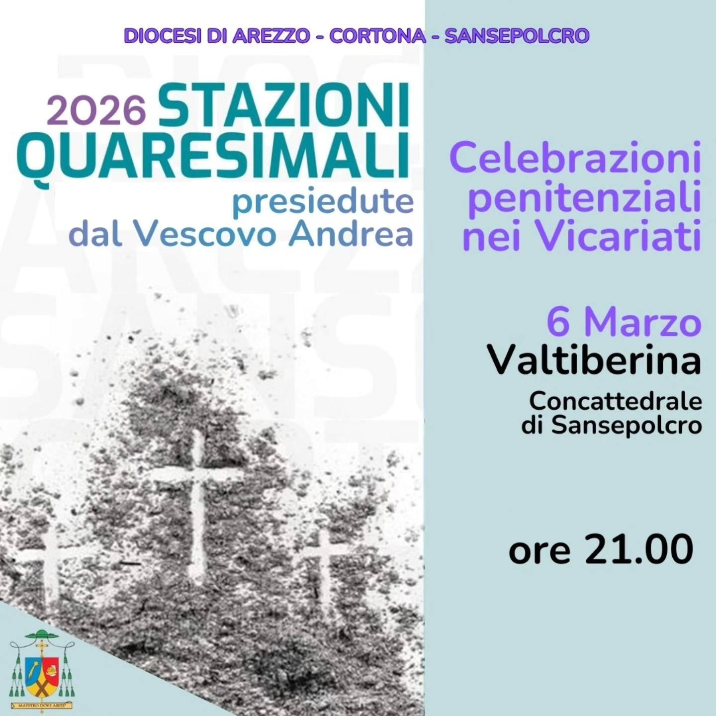 Per il Vicariato Foraneo della Valtiberina l’appuntamento è in programma venerdì 6 marzo 2026 alle ore 21.00 presso la Concattedrale di Sansepolcro, dove si terrà una celebrazione penitenziale presieduta dal Vescovo Andrea Migliavacca.