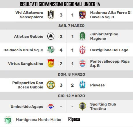 Guardando agli Under 14, la formazione allenata da Piercarlo Laura scenderà in campo giovedì in trasferta contro l’Umbertide Agape. I bianconeri, con 31 punti e due partite in meno, si trovano stabilmente al sesto posto in classifica, nonostante la presenza in rosa di diversi ragazzi sotto età. Dopo la gara di Umbertide, il prossimo impegno sarà in casa contro la Virtus Sangiustino.