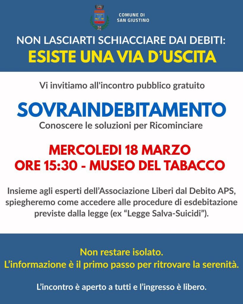 Un incontro pubblico per informare i cittadini sulle possibilità offerte dalla legge per uscire da situazioni di difficoltà economica. L’iniziativa, promossa dal Comune di San Giustino, si terrà mercoledì 18 marzo alle ore 15.30 presso il Museo del Tabacco.