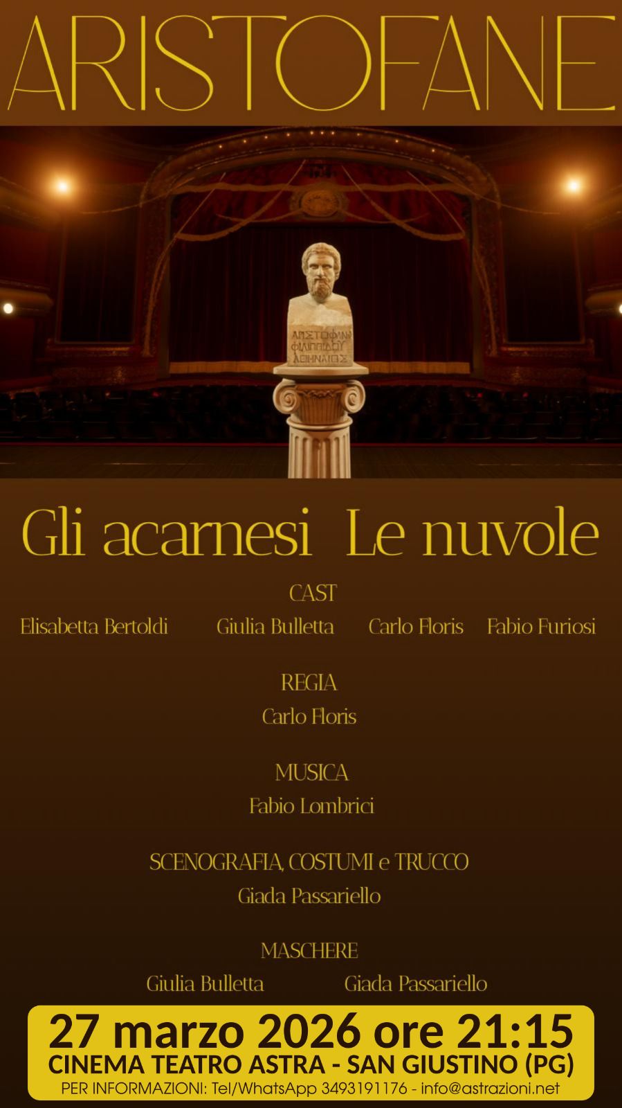 SAN GIUSTINO – Un grande classico del teatro antico rivive in chiave contemporanea. Venerdì 27 marzo 2026, alle ore 21:15, il Cinema Teatro Astra di San Giustino ospiterà lo spettacolo “Gli Acarnesi – Le Nuvole”, portato in scena dalla Sesta Compagnia.