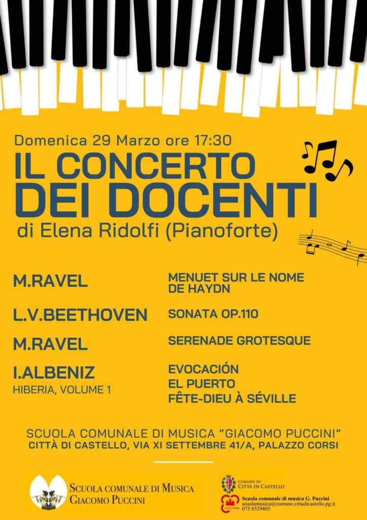 Il primo evento è in programma domenica 29 marzo alle ore 17:30 con il Concerto dei Docenti, che vedrà protagonista la pianista Elena Ridolfi. Un’esibizione che promette di accompagnare il pubblico in un viaggio musicale intenso e coinvolgente, tra tecnica e sensibilità artistica.