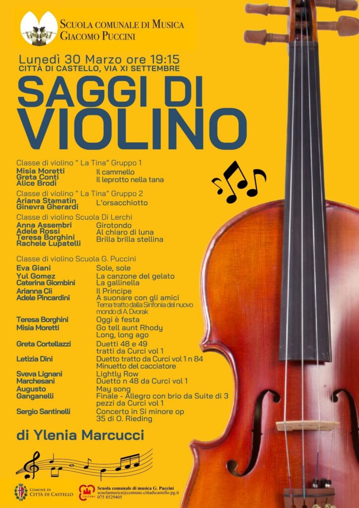 Il secondo appuntamento si terrà lunedì 30 marzo alle ore 19:15 con i Saggi di Violino, protagonisti gli allievi della scuola primaria di La Tina e Lerchi insieme agli studenti della scuola comunale, guidati dall’insegnante Ylenia Marcucci. Una serata dedicata ai giovani musicisti e al loro percorso di crescita artistica.