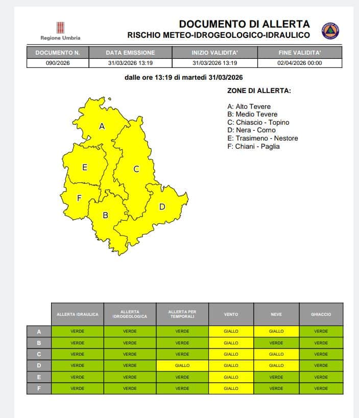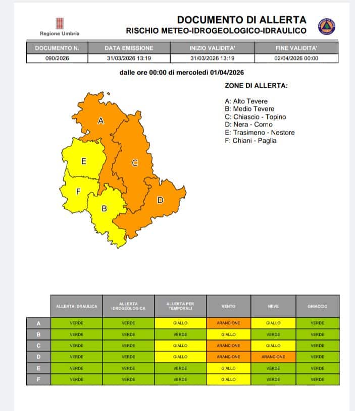 La Regione Umbria ha emesso il Documento di Allerta n. 090/2026 per rischio-meteo-idrogeologico-idraulico su tutte le zone di allerta regionali.